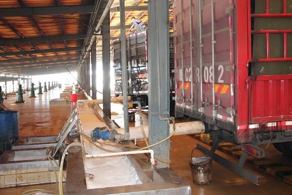 膠水車在金聯(lián)橡膠加工分公司卸膠水。簡(jiǎn)日明 攝