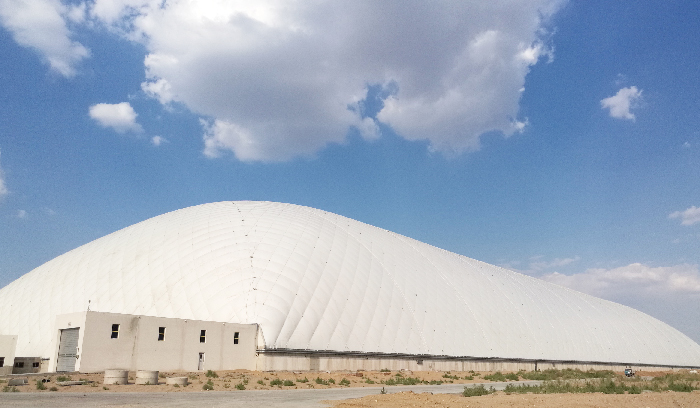 充氣膜煤棚所用膜材具有優(yōu)越的透光和UV防紫外線隔熱性能,使得在室外酷熱的情況下氣膜內(nèi)部保持較舒適的溫度,并且嚴(yán)寒時(shí)期能夠很好的保溫防風(fēng),可以保障人員的正常工作環(huán)境。