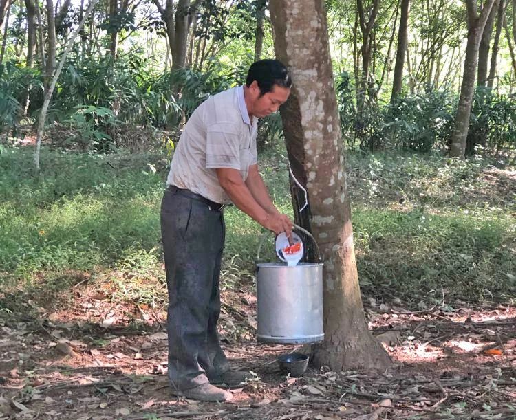 2005年,年僅19歲的溫業(yè)國(guó)接過(guò)母親承包的兩千多株割膠崗位,拿起膠刀,開(kāi)始了他的割膠生涯,到如今,已與橡膠打了18年的交道。